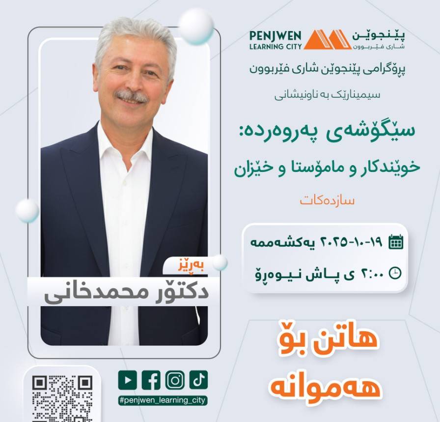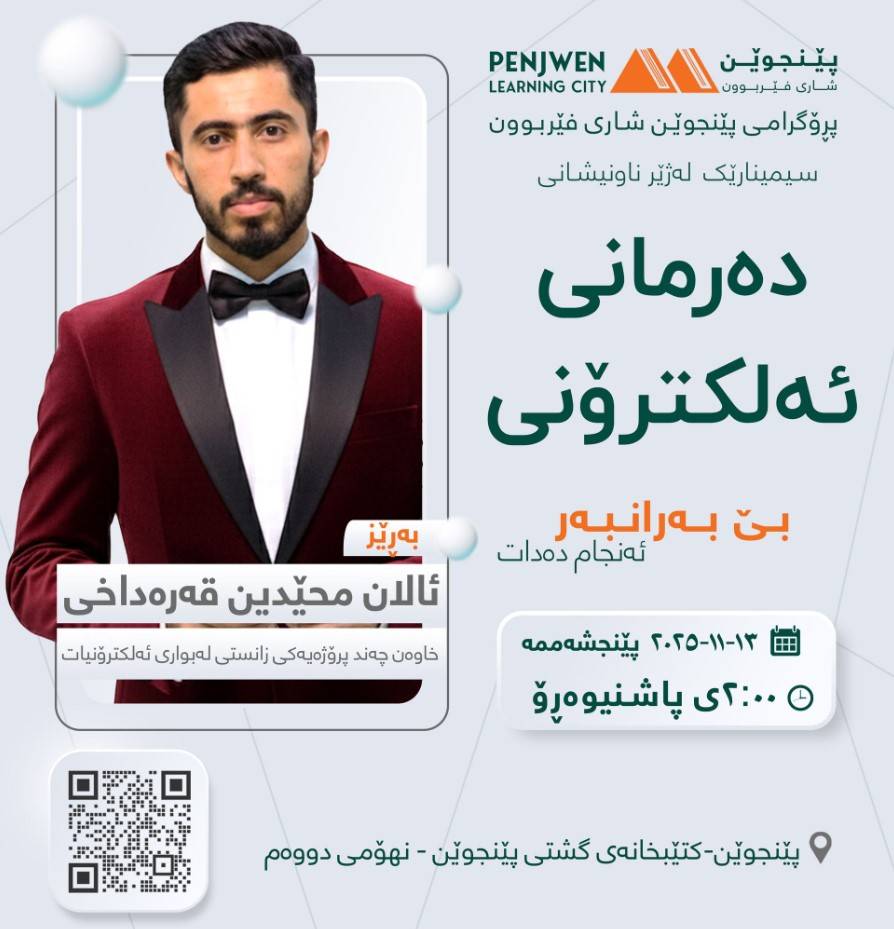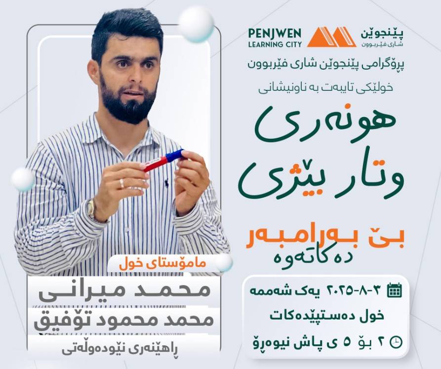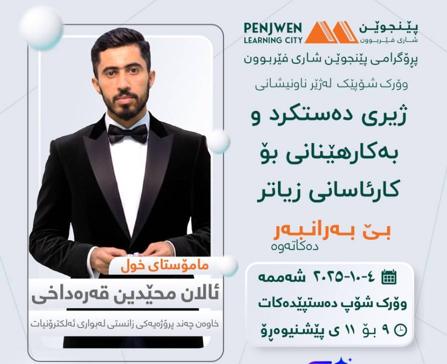 لە سەردەمێکدا کە تەکنەلۆژیای ژیری دەستکرد گۆڕانکارییەکی گەورە لە جیهانی کار و پەروەردەدا دروستکردووە پڕۆگرامی پێنجوێن شاری فێربوون وۆرک شۆپێکی گرنگ ئەنجامدەدات بە ناونیشانی (ژیری دەستکرد و بەکارهێنانی بۆ کارئاسانی زیاتر)، ئەم وۆرک شۆپە تایبەتە دەرفەتێکی بێ وێنەیە بۆ مامۆستایان و خوێندکاران و خاوەن پیشەکان کە بتوانن ئەم تەکنەلۆژیا بەهێزە فێربن و لە کاری ڕۆژانەیاندا بەکاری بهێنن. لەم وۆرکشۆپەدا فێری ئەوە دەبیت کە چۆن ئەو ئەرکانەی کە چەند کاتژمێرێک کاتیاندەبرد، بە چەند خولەکێک تەواو بکەیت، هەروەها چۆن تێنووسی پلانی وانە ئامادە بکەیت و ڕاوێژی تایبەت بۆ خوێندکارانت دابنێیت بە شێوەیەکی زیرەک و کاریگەر.کات: شەممە، ی٩ بەیانی تا ١١ (٢ کاتژمێر)بۆ کێ؟مامۆستایانی بیرکاری، فیزیا، ئینگلیزی و زانستەکان و سەرجەم مامۆستایانی دیکەخوێندکارانی ئامادەییخاوەن پیشە جیاوازەکانچی فێردەبیت؟ژیری دەستکرد چییە و چۆن کاردەکات؟ئایا هەڵە دەکات؟مامۆستایان چۆن سوودی لێ ببینن؟ئەو کارەی بە کاتژمێرەکان دەیکرد، ئێستا بە خولەکەکان بیکە!دانانی تێنووسی پلانی وانە بە خێراییوەرگرتنی ڕاوێژی تایبەت بۆ خوێندکارانباسە گرنگەکانی ترکەرەستەی پێویست: موبایل یان لاپتۆپ + ئینتەرنێتت پێبێتڕاهێنەر: ئالان قەرەداغیخاوەن ئەزموون و خەڵاتی ناوخۆیی و نێودەوڵەتی لە تەکنەلۆژیاتۆمارکردن: لەڕێگەی ئەم فۆڕمە ئۆنلاینەوە دەبێت:https://forms.gle/fzyv91sVDG2JdQs47 واتای ئەم وۆرک شۆپە: کاتی خۆت بپارێزە، کارەکانت خێراتر بکە، و شارەزاتر بە!