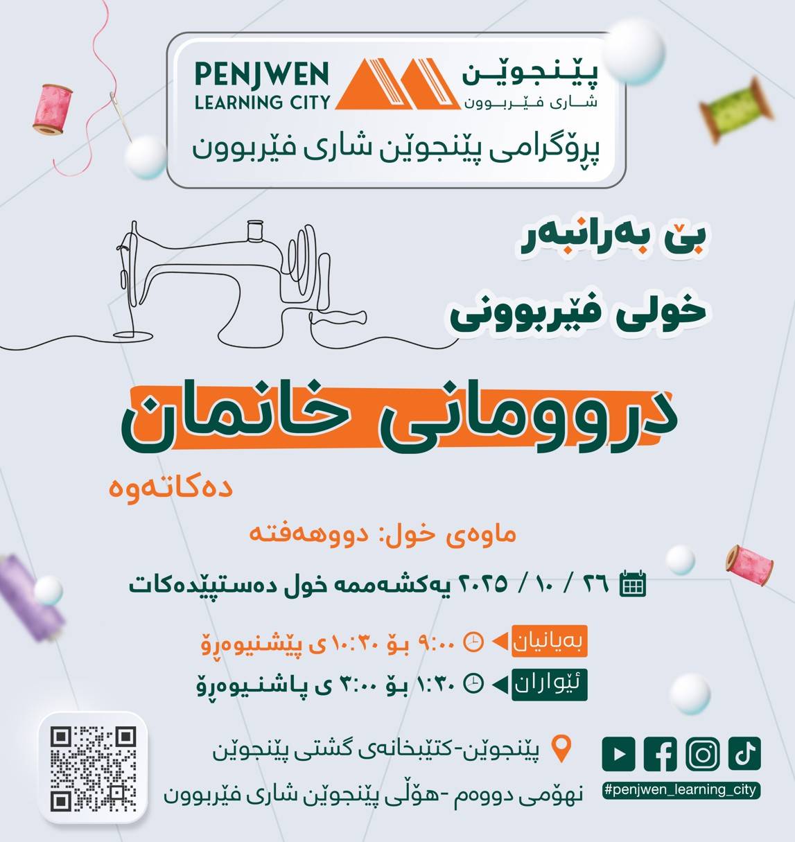 خانمانی بەڕێزی پێنجوێن، ئەم خولە لە لایەن مامۆستای شارەزا و بە ئەزمونەوە دەوترێتەوە، لە بەرواری ٢٦-١٠-٢٠٢٥ ڕۆژی یەکشەممە دەست پێدەکات و