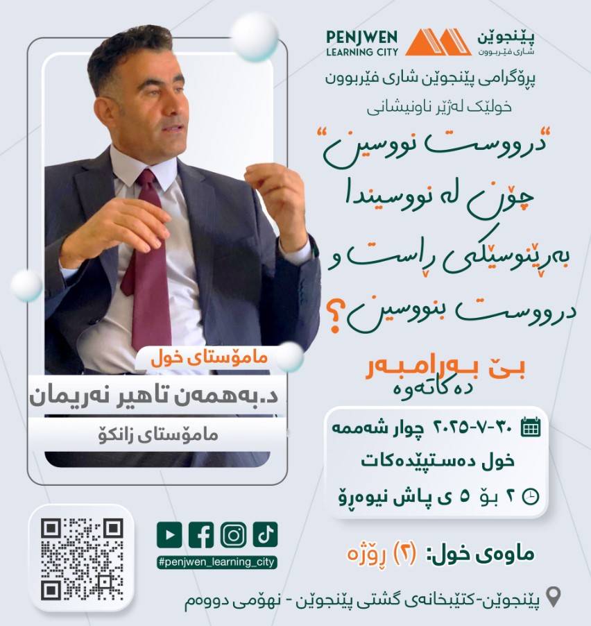 پڕۆگرامی پێنجوێن شاری فێربوون بە شانازییەوە ڕایدەگەیەنێت کە خولێکی نوێ و تایبەت بۆ فێربوونی هونەری ڕێنووسی کوردی و درووستنووسی لەلایەن پسپۆڕێکی ناسراوەوە پێشکەش دەکرێت.