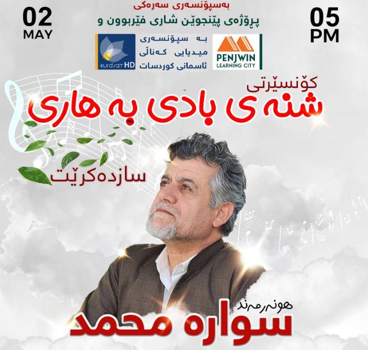 کۆنسێرتێک بۆ هونەرمەندی ناوداری کورد (سوارە محمد) لە پێنجوێن ساز دەکرێت ..بەسپۆنسەری سەرەکی (پڕۆژەی پێنجوێن شاری فێربوون) و سپۆنسەری میدیای دامەزراوەی میدیایی کوردسات، ڕۆژی پێنجشەممە بەرواری ٢-٥-٢٠٢٣ لە هۆڵی بۆنەکانی شارۆچکەی پێنجوێن کۆنسێرتێکی هونەری بۆ هونەرمەندی ناسراوی کوردستان (سوارە محمد) و ژمارەیەک ژەنیاری بەتوانا و بەئەزموون بەناونیشانی (شنەی بادی بەهاری) سازدەکرێت، لە کاتژمێر (٥)ی ئێوارە بەڕێوەدەچێت.تێبینی : هاتن بۆ هەموانە.