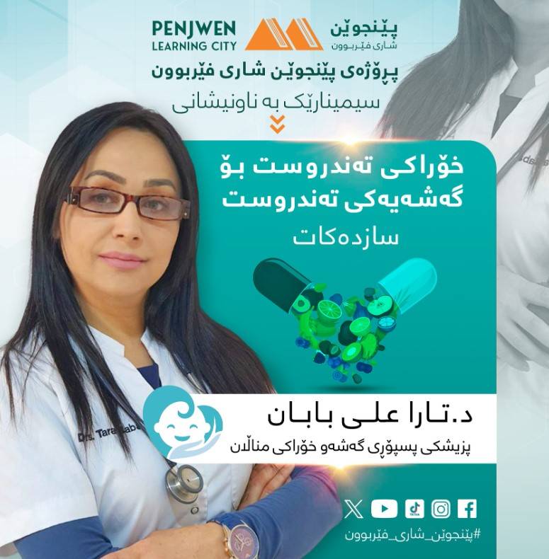 بۆ ئەو بەڕێزانەی خوازیاری فێربوونی درومانبوون و داوای کردنەوەی خولەکەیان دەکردپڕۆژەی پێنجوێن شاری فێربوون بەمەبەستی پێشخستنی تواناکانی خانمان، هەڵدەستێت بەکردنەوەی خولی فێربوونی سەرەتایی درومان بێ بەرامبەر بۆخانمانی بەڕێزی پێنجوێن، ئەم خولە لە لایەن مامۆستای شارەزا و بە ئەزمونەوە دەوترێتەوە، لە بەرواری ١٥-١٢-٢٠٢٤ ڕۆژی یەک شەممە دەست پێدەکات و(١٠) ڕۆژ دەخایەنێت،لەکۆتایی خولەکەدابڕوانامەی بەشداربوون دەبەخشرێتە فێرخوازە بەڕێزەکان.تێبینی:ئەوخانمانەشی خوێندەواریان نییە دەتوانن بەشداری بکەنڕۆژانی ناوتۆمارکردن:لە بەرواری ١١بۆ ١٤ی ١٢ی ٢٠٢٤ فێرخواز دەتوانێت لە ڕێگەی ئەم فۆڕمە ئۆنلاینەوە ناو تۆمار بکات:https://forms.gle/qu3g2fji42Ku3wiW9یاخود لەڕێگەی ئەم ژمارە مۆبایلانەوە٠٧٥١٨٣٨٨٠٨٦٠٧٧٠٦٠١٠٤٠٤کاتەکانی خول :بەیانیان : ٠٩:٠٠ بۆ ١٠:٣٠دوای نیوەڕوان:٠١:٣٠ بۆ ٠٣:٠٠شوێن:کتێبخانەی گشتی پێنجوێن - نهۆمی دووەم