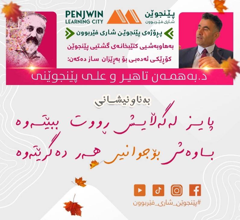 "لە پایزدا، کاتێک دارەکان جامەی سەوزی خۆیان دادەکەنن، سروشت وانەیەکی قووڵمان فێر دەکات: جوانی تەنها لە ڕووکەشدا نییە. هەر وەک چۆن دارێک دوای گەڵاڕێزان، بێ پۆشاک، هێشتا پڕە لە ژیان و بەڵێنی بەهارێکی نوێ، ئاواش مرۆڤ لە هەموو قۆناغەکانی ژیانیدا خاوەنی جوانی و بەهای خۆیەتی.بەناونیشانی:"پایز لەگەڵاش ڕووتببێتەوەباوەش بۆ جوانی هەردەگرێتەوە"پڕۆژەی پێنجوێن شاری فێربوون بەهاوبەشی کتێبخانەی گشتی پێنجوێن کۆڕێکی ئەدەبی سازدەکەن بۆ بەڕێز (د.بەهمەن تاهیر و مامۆستا علی پێنجوێنی).لە کتێبی 'ژنێک نایەوێت ژن بێت'دا، عەلی پێنجوێنی بە شێوەیەکی هونەری باس لە گەڕانی مرۆڤ بەدوای ناسنامەی ڕاستەقینەی خۆیدا دەکات. دکتۆر بەهمەن تایەر، بە توانای ڕەخنەگرانە و تێگەیشتنی قووڵی بۆ ئەدەبی هاوچەرخ، خوێندنەوەیەکی تایبەت بۆ ئەم نوسینەئەدەبیەی مامۆستا علی پێنجوێنی پێشکەش دەکات. خوێندنەوەیەک کە تیشک دەخاتە سەر ئەو ڕەهەندە شاراوانەی کە نووسەر لە چیرۆکەکەدا خستوویەتیە ڕوو.لەم کۆڕە ئەدەبیەدا، دکتۆر بەهمەن کە(دکتۆراکەی لەزمانی کوردی و پەروەردەدایە) بە شێوەیەکی ئەکادیمی و زانستی، لایەنە جیاوازەکانی ئەم بەرهەمە شیدەکاتەوە."تێبینی : وەک دیارییەک نوسەر لەکۆتایی کۆڕەکەدا کتێبی دیوانە شیعریەکەیان بەناونیشانی 'ژنێک نایەوێت ژن بێت' دەکەنە دیارییەکی ناوازە و پایزانە بۆ ئامادەبووانی کۆڕ.ڕێکەوت: ٢٦-١٠-٢٠٢٤ڕۆژی: شەممەکات: ٣:٠٠ ی پاشنیوەڕۆشوێن: کتێبخانەی گشتی پێنجوێن - نهۆمی دووەم.هاتن بۆ هەمووانە.
