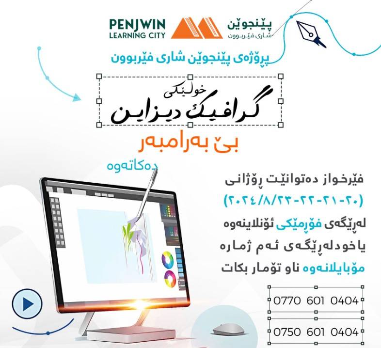 پڕۆژەی پێنجوێن شاری فێربوون خولێکی فێربوونی (گرافیک دیزاین) بێ بەرامبەر دەکاتەوە بۆ 🚻هەردوو ڕەگەز, ماوەی دوو هەفتە دەخایەنێت و لە لایەن 👨‍🏫مامۆستای شارەزا و بە ئەزمونەوە وانەکان دەوترێتەوە،