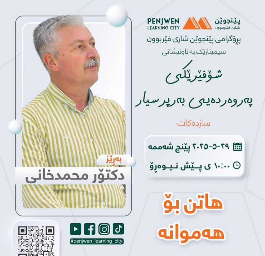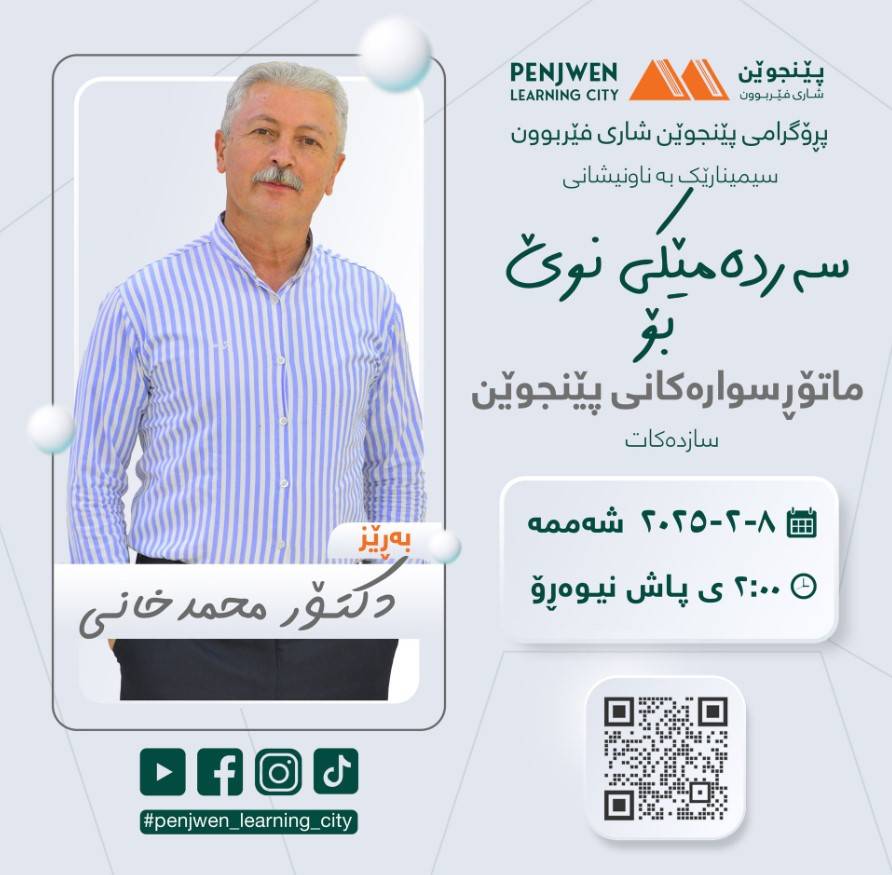 ڕۆژی پێنجشەممە ڕێکەوتی ٢٩/٥/٢٠٢٥کاتژمێر ١٠ی سەرلەبەیانی لە کتێبخانەی گشتی پێنجوێن،لەچوارچێوەی کاروچالاکییەکانی پڕۆگرامی پێنجوێن شاری فێربوون سیمینارێک بەناونیشانی"شۆفێرێکی پەروەردەیی بەرپرسیار" بۆ بەڕێز دکتۆر محمدخانی ڕێکدەخرێت.ئامانجەکانی سیمینار، بریتین لە گەیاندنی ئاگاداری دەربارەی بەرپرسیارێتی شۆفێران لە کۆمەڵگا، پەروەردەکردنی شیاوی شۆفێران و باشترکردنی کەسایەتییان، کەمکردنەوەی ڕووداوەکانی ڕێگا و دروستکردنی ئاسایشی هاتووچۆ، هەروەها بەرزکردنەوەی ئاستی زانیاری و شارەزایی شۆفێران.ئەم سیمینارە بۆ هەموو ئەو کەسانەیە کە پەیوەندییان بە بوارەکانی شۆفێرانی هەموو جۆرەکانی ئۆتۆمبێل، فێرکارانی شۆفێری لە قوتابخانەکان، کارمەندانی ئیدارەی هاتووچۆ و گواستنەوە، هەروەها خەڵکی بەرپرسیار و خۆشەویستانی کۆمەڵگاوە هەیە.ئەم چالاکییە لە چوارچێوەی هەوڵەکانی بەردەوامی پێگەیشتن بە کۆمەڵگایەکی ئاسوودەتر و بەرپرسیارانەتر ڕێکدەخرێت. بەشداریکردن بۆ هەموان کراوەیە و هیچ تێچووێکی نییە."شۆفێرێکی پەروەردەیی بنەمای کۆمەڵگایەکی ئاسوودەیە پارێزراوە لە ڕوداوی نەخوازراو"