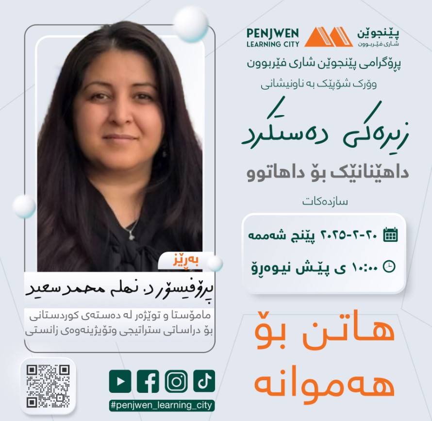 زیرەکی دەستکرد - داهێنانێک کە ژیانمان دەگۆڕێتلە درێژەی کاروچالاکییەکانی پڕۆگرامی پێنجوێن شاری فێربوون، لە ڕۆژی پێنج شەممەدا، وۆرکشۆپێکی گرنگ بەڕێوەدەچێت سەبارەت بە کاریگەری و گرنگی زیرەکی دەستکرد لە ژیانی داهاتووماندا. وۆرک شۆپەکە لەلایەن بەڕێز(پرۆفیسۆر دکتۆرە نهلە محمد سعید)ەوە پێشکەش دەکرێت کە بەڕێزیان "مامۆستا و توێژەر لە دەستەی کوردستانی بۆ دراساتی ستراتیجی وتۆیژینەوەی زانستین".لە وۆرک شۆپەکەدا تیشک دەخرێتە سەر ئەو گۆڕانکارییە گەورانەی کە زیرەکی دەستکرد لە بوارەکانی تەندروستی، پەروەردە، پیشەسازی و ژیانی ڕۆژانەماندا دروستی دەکات.هاوکات باس لە دەرفەتە نوێیەکان و ئاستەنگەکانی بەردەم پەرەسەندنی زیرەکی دەستکرد دەکرێت. هەروەها گرنگی ئامادەبوون بۆ ئەو گۆڕانکارییانە و چۆنیەتی سوود وەرگرتن لەم تەکنەلۆژیا نوێیە دەخرێتە ڕوو.ئەم وۆرکشۆپە دەرفەتێکی باشە بۆ ناسینی ئەو تەکنەلۆژیا نوێیەی کە داهاتووی مرۆڤایەتی دەگۆڕێت و دەبێتە هۆی دروستکردنی هەلی کار و داهێنانی نوێ.تێبینی: هـــــــاتــــــن بــــــــۆ هــــــەمــــــوانــــــەڕێکەوت: ٢٠-٢-٢٠٢٥.ڕۆژ: پێنج شەممە.کات: ١٠ی پێشنیوەڕۆ.شوێن: کتێبخانەی گشتی پێنجوێن - نهۆمی دووەم.