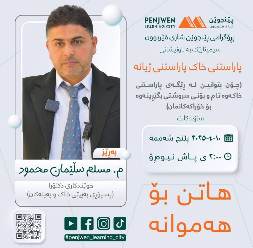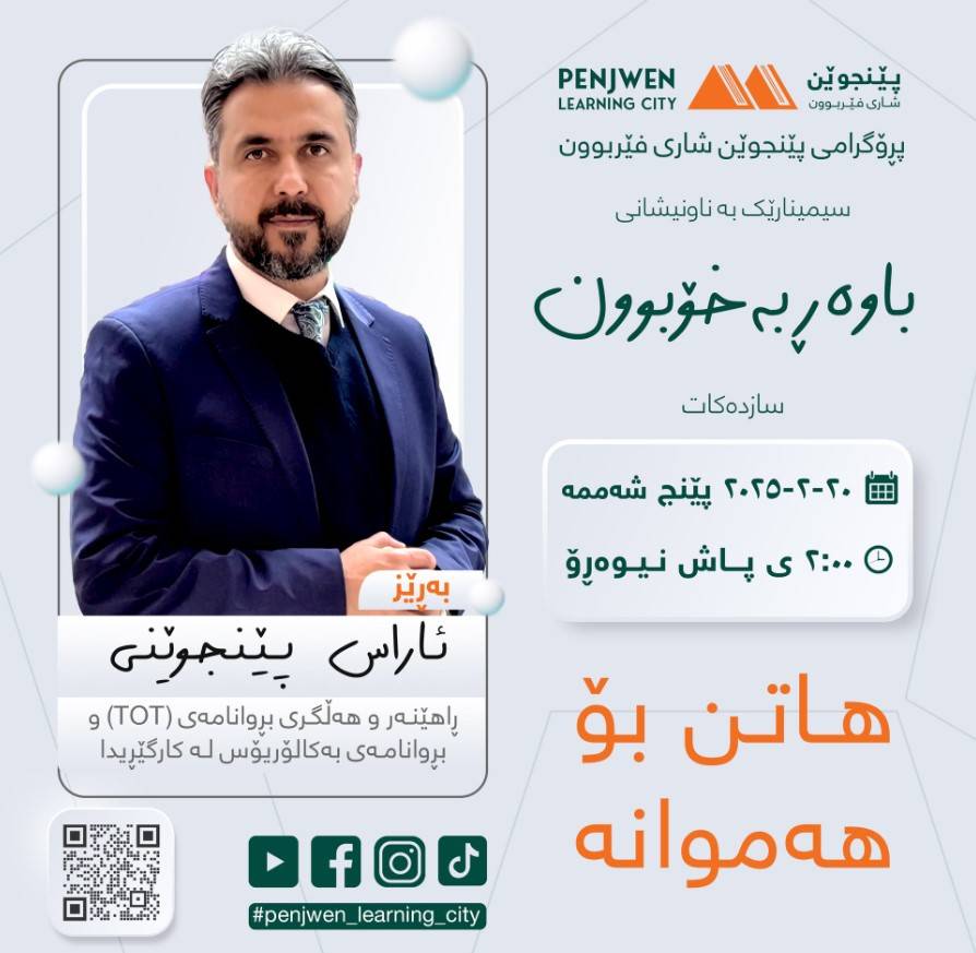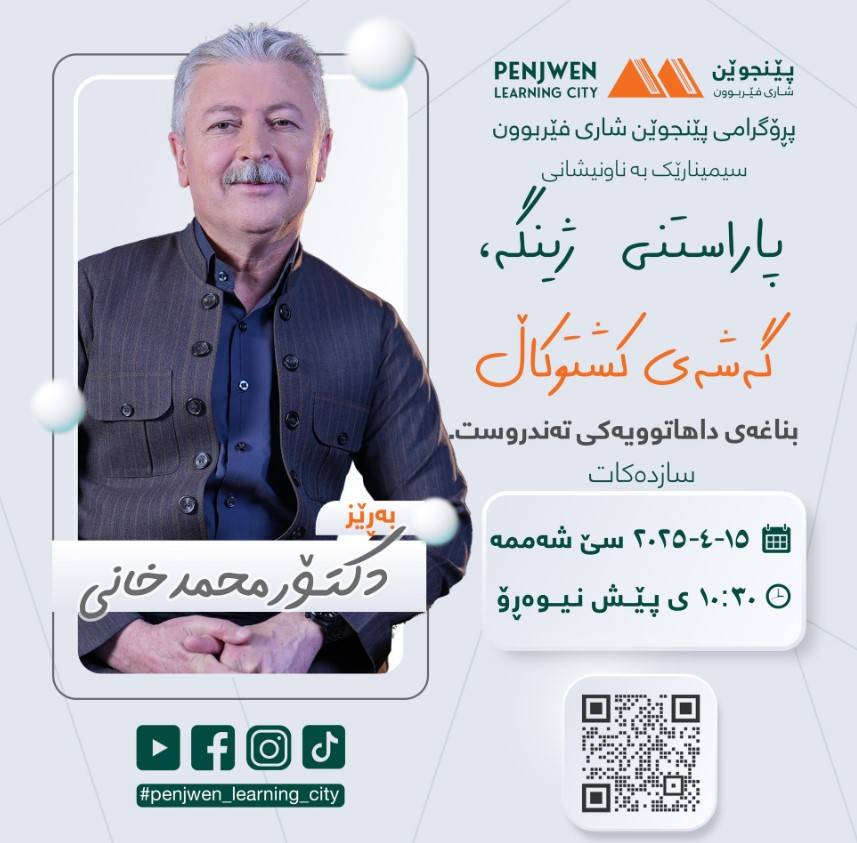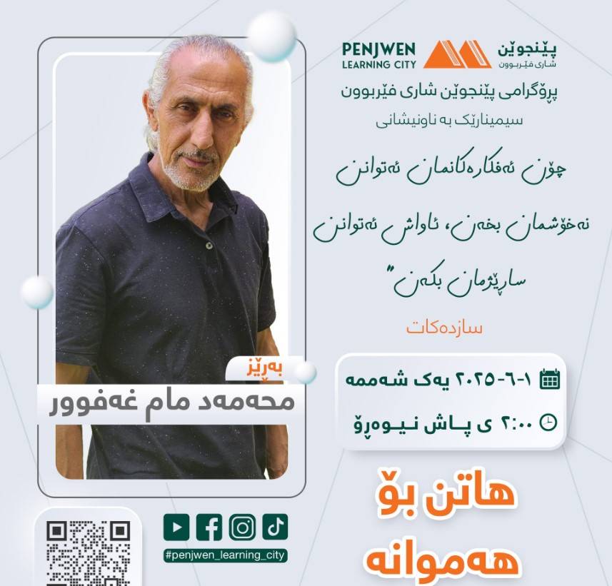 پڕۆگرامی پێنجوێن شاری فێربوون سیمینارێکی تایبەت بەڕێوەدەبات لەسەر بابەتی "چۆن ئەفکارەکانمان ئەتوانن نەخۆشمان بخەن، ئاوهاش ئەتوانن ساڕێژمان بکەن".ئەم سیمینارە لە لایەن بەڕێز محمد مام غەفوور، شارەزای بواری جوڵەی وەرزشی و گۆڕینی ستایلی ژیان، خاوەنی بڕوانامەی ئەکادیمی (بریجمەن) لە ووڵاتی هۆڵەندا، پێشکەش دەکرێت.ئەم سیمینارە ئامانجی ئەوەیە کە هاوڵاتیان ئاگادار بکاتەوە لە:- کاریگەری ئەفکاری نەرێنی لەسەر تەندروستی جەستەیی و دەروونی- ڕێگاکانی بەرەنگاربوونەوەی بیرکردنەوەی نەرێنی- شێوازەکانی گۆڕینی ستایلی ژیان بۆ باشترکردنی تەندروستی گشتیدەربارەی پێشکەشکار:بەڕێز محمد مام غەفوور خەڵکی شارۆچکەی پێنجوێنە و ڕاهێنەرە لە بواری گۆڕینی ستایلی ژیان و تەندروستی دەروونی. خاوەنی بڕوانامەی ئەکادیمی (بریجمەن)ی ووڵاتی هۆڵەندایە و ئەزموونێکی فراوانی هەیە لە بواری ڕاهێنانی جوڵەی وەرزشی و تەکنیکەکانی گۆڕینی ستایلی ژیان، هەروەها ماوەی ٢٣ ساڵە لەوڵاتی هۆڵەندا دەژی- ڕۆژ: یەک شەممە- ڕێکەوت: ١ی حوزەیرانی ٢٠٢٥- کات: کاتژمێر ٢:٠٠ی پاش نیوەڕۆ شوێن: کتێبخانەی گشتی پێنجوێن - نهۆمی دووەم.