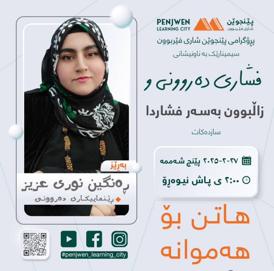 سیمینارێکی گرنگ و تایبەت سەبارەت بە فشاری دەروونی لەلایەن پسپۆری دەروونی و ڕاهێنەر (ڕەنگین نوری عزیز)ەوە پێشکەش بکرێت.لەم سیمینارەدا،ڕەنگین نوری کە خاوەن ئەزموونێکی ١٤ ساڵەیە لە بواری ڕێنمایی دەروونی و پەروەردەیی و نووسەری دوو نامیلکەی گرنگی پەروەردەییە، باس لە چەمکی فشاری دەروونی و چۆنیەتی زاڵبوون بەسەریدا دەکات.سیمینارەکە ڕۆژی پێنج شەممە، ڕێکەوتی ٢٧-٢-٢٠٢٥، کاتژمێر ٢ی پاش نیوەڕۆ بەڕێوە دەچێت و تێیدا تیشک دەخرێتە سەر پێناسەی فشاری دەروونی، هۆکار و نیشانەکانی، هەروەها باسکردنی ڕێگاچارە و ڕێنماییە پێویستەکان بۆ بەرەنگاربوونەوەی.جێی ئاماژەیە کە ڕەنگین نوری ڕاهێنەری بریتش کاونسڵ و هاوکات کەسایەتییەکی چالاکە لە بوارەکانی کۆمەڵایەتی، ژینگەپارێزی و کاری خێرخوازیدا.دەرگای بەشداریکردن لەم سیمینارە بۆ هەموو کەسێک کراوەیە و هاتن بۆ هەموانە.شوێن: کتێبخانەی گشتی پێنجوێن - نهۆمی دووەم.
