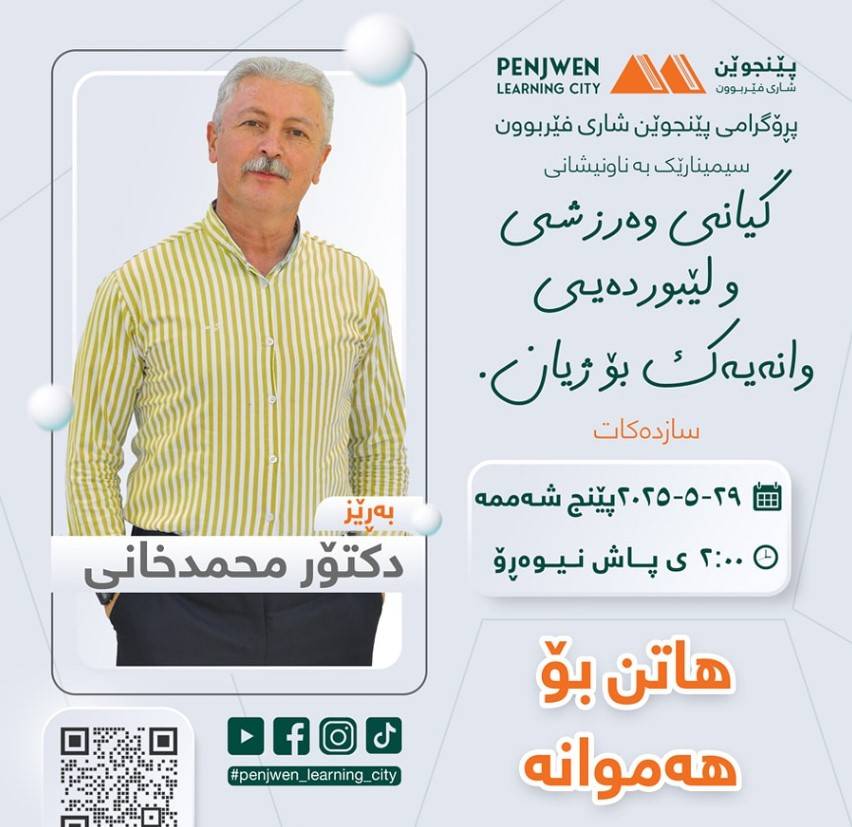 ڕۆژی پێنجشەممە ڕێکەوتی ٢٩/٥/٢٠٢٥ لە کاتژمێر ٢:٠٠ی پاش نیوەڕۆ لە نهۆمی دووەمی کتێبخانەی گشتی پێنجوێن لەلایەن پڕۆگرامی پێنجوێن شاری فێربوونەوە سیمینارێک لەژێر ناونیشانی "گیانی وەرزشی ولێبوردەیی وانەیەک بۆ ژیان" بۆ بەڕێز دکتۆر محمدخانی ئەنجام دەدرێت.ئەم سیمینارە تایبەتە لەسەر یەکێک لە گرنگترین بابەتەکانی ژیانی مرۆڤ کە بریتییە لە گیانی وەرزشی و لێبوردەیی و چۆنیەتی وەرگرتنی وانە و ئەزموونی ئەرێنی لە ژیانی ڕۆژانەدا. ئەم بابەتە بۆ هەموو ئەو کەسانەی کە دەیانەوێت لە ژیانیاندا بە ڕۆحێکی بەرز و لێبوردەیی ڕووبەڕووی گرفت و کێشەکان ببنەوە گرنگ و پێویستە.لەم سیمینارەدا باس لە گرنگی گیانی وەرزشی و چۆنیەتی جێبەجێکردنی لە ژیانی ڕۆژانەدا دەکرێت، هەروەها ڕۆڵی لێبوردەیی لە دروستکردنی کەسایەتییەکی بەهێز و بەرگەگرتن لە ئاستەنگەکانی ژیان شی دەکرێتەوە. ئەم بابەتە زۆر گرنگە بۆ هەموو تەمەنێک و هەموو پیشەیەک، چونکە گیانی وەرزشی و لێبوردەیی بنەماکانی سەرکەوتن و ئاسودەیی دەروونین.سیمینارەکە بۆ هەموو ئەو کەسانەیە کە خۆشەویستی وەرزش و خوێندنەوەی کتێبی ژیان و بەدواداچوونی باشترین ڕێگاکانی ژیان دەکەن، هەروەها بۆ مامۆستایان، قوتابیان، دایک و باوکان، کارمەندان و هەموو ئەو کەسانەی کە دەیانەوێت لە ژیانیاندا بە ڕۆحێکی گەورە و لێبوردەیی بەرەو پێشەوە بڕۆن.هاتن بۆ هەمووانە، هەر کەسێک دەتوانێت ئامادەبێت و سوودمەند بێت لەم دەرفەتە گرنگەی فێربوون و پێگەیشتنی زیاتر لەسەر ئەم بابەتە گرنگەی ژیان. ئەمە دەرفەتێکی نایابە بۆ هەموان کە بتوانن وانەیەکی گرنگ لە ژیان فێربن.