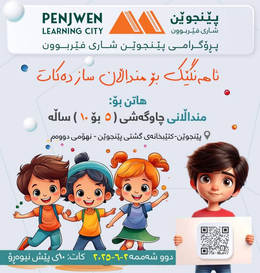 پێنجوێن- لە هەنگاوێکی جوان و بایەخپێدراودا، پڕۆگرامی پێنجوێن شاری فێربوون ئاهەنگێکی نایاب و خنجیلە بۆ منداڵانی شارۆچکەی پێنجوێن سازدەکات بەبۆنەی ڕۆژی جیهانی منداڵانەوە.ئەم چالاکییە تایبەتە کە بە مەبەستی دڵ خۆشکردنی منداڵانی ئازیز و چاوگەشی ناوچەکە ڕێکخراوە، بەڕووبەڕووبوونەوەیەکی جوان و یادگارانە لەگەڵ منداڵان دەبێت.هاتن بۆ:منداڵانی چاوگەشی ( ٥ بۆ ١٠ ) ساڵەڕۆژ و ڕێکەوت:دووشەممە، ٢-٦-٢٠٢٥کات: ١٠:٠٠ی سەرلەبەیانیشوێن:کتێبخانەی گشتی پێنجوێن - نهۆمی دووەمچالاکییەکانی ئاهەنگەکە:ئەم ئاهەنگە چەندین چالاکی جۆراوجۆر و سەرنجڕاکێش لەخۆدەگرێت، بۆ نموونە:یاری فکری و جەستەیی- بۆ پەرەپێدانی توانا جۆراوجۆرەکانی منداڵانچالاکی هونەری و دەستکرد- بۆ دەرخستنی بەهرەکانیانچیرۆک گێڕانەوە - بۆ پەرەپێدانی خوێندنەوە و گوێگرتنگۆرانی بۆ کەیف خۆشکردنی منداڵەکانناشتا و شیرینی تایبەت- بۆ تەواوکردنی خۆشی ڕۆژەکەبانگهێشت:پڕۆگرامی پێنجوێن شاری فێربوون بە گەرمترین شێوە هەموو منداڵانی ئازیز و چاوگەش لەگەڵ خێزانەکانیان بانگهێشت دەکات بۆ بەشداریکردن لەم ڕۆژە تایبەتەدا.ئەم ئاهەنگە هەلێکی نایابە بۆ خۆشکردن و دروستکردنی یادەوەری جوان لە دڵی منداڵاندا.
